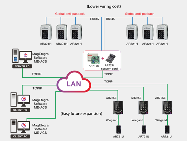 Local Area Network or multi-door controller. The more readers you have, the more saving you will get.