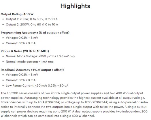 KEYSIGHT E36234A 400W Autoranging Dual Output Power Supply, 60V, 10A