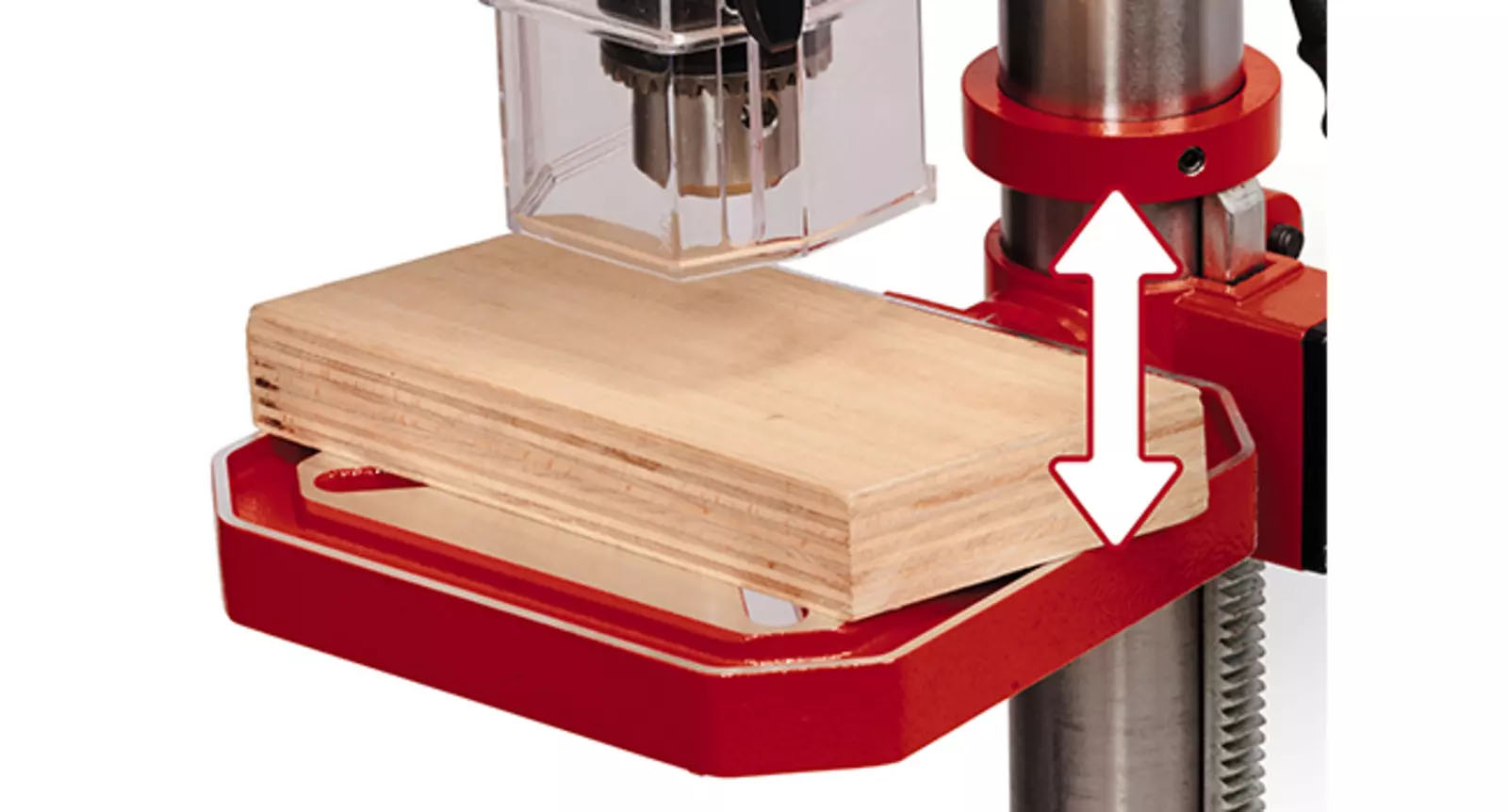 | With the help of the 12-stage speed regulation, the speed between 200 and 2,450 rpm can be adjusted to the respective material and application without tools, precisely and according to the material. | For maximum flexibility, the drilling table is infinitely adjustable in height, rotatable up to 90° and tiltable up to 45°. The robust steel base ensures the necessary stability of the bench drill. | With the adjustable, robust depth stop, the precisely desired drilling depth can be defined up to maximum of 60 mm. In this way, precise and fast drilling is also possible in series. | Thanks to the MK2 adapter and the robust sprocket chuck, all common Morse taoer drills and drills with a drill diameter between 1.5 and 16 mm can be inserted into the bench drill. |