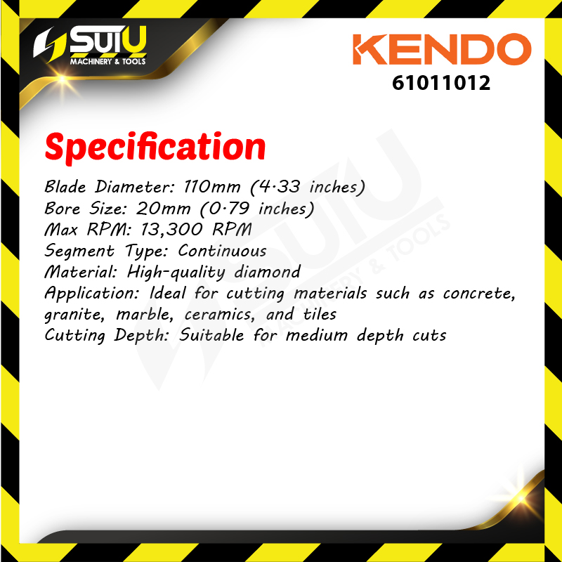 - The KENDO 61011012 is equipped with high-quality,continuous diamond segments that provide superior cutting performance and durability on various materials,including concrete,granite,and marble