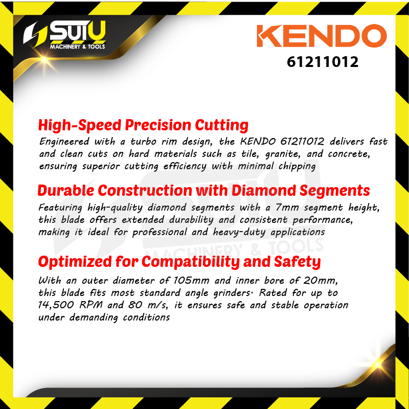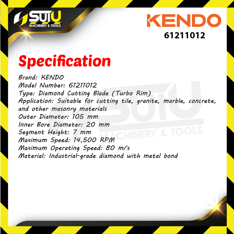 - Engineered with a turbo rim design,the KENDO 61211012 delivers fats and clean cuts on hard materials such as tile,granite,and concrete,ensuing superior cutting efficiency with minimal chipping