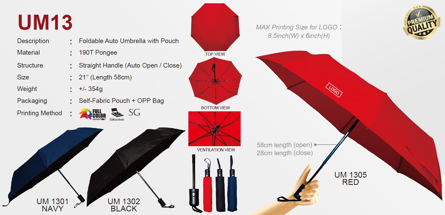 Packaging: OPP Bag and Self-Fabric Pouch — Oriented polypropylene plastic bag that provides clear visibility, protection, and neat presentation. + A matching colored self-fabric pouch that offers organized storage and easy portability with protective pouch packaging for the umbrella.