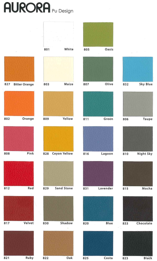 White 801Orange 802Maize 803Oasis 805Taupe 806Olive 807Pink 808Yellow 809 Night Sky 810 Green 811Red 812Mocha 815 Lagoon 816Velvet 817 Blue 820 Ruby 821 Oak 822 Black 823Costa 825Light Orange 827Ceyon Yellow 828Sand Stone 829Shadow 830Lavender 831Sky Blue 832Chocolate 833