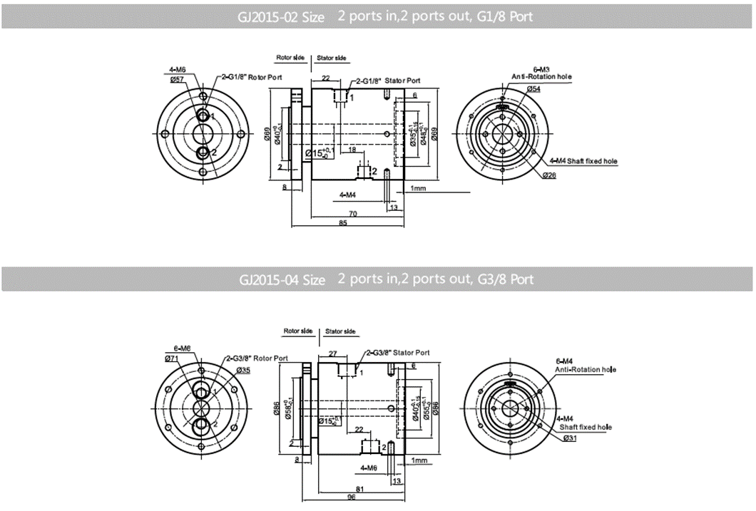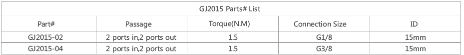 GJ2015 is 2 passages through bore rotary union with bore size 15mm, supporting connection size G1/8