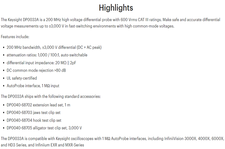 KEYSIGHT DP0033A High-Voltage Differential Probe, 200 MHz, 3,000 V