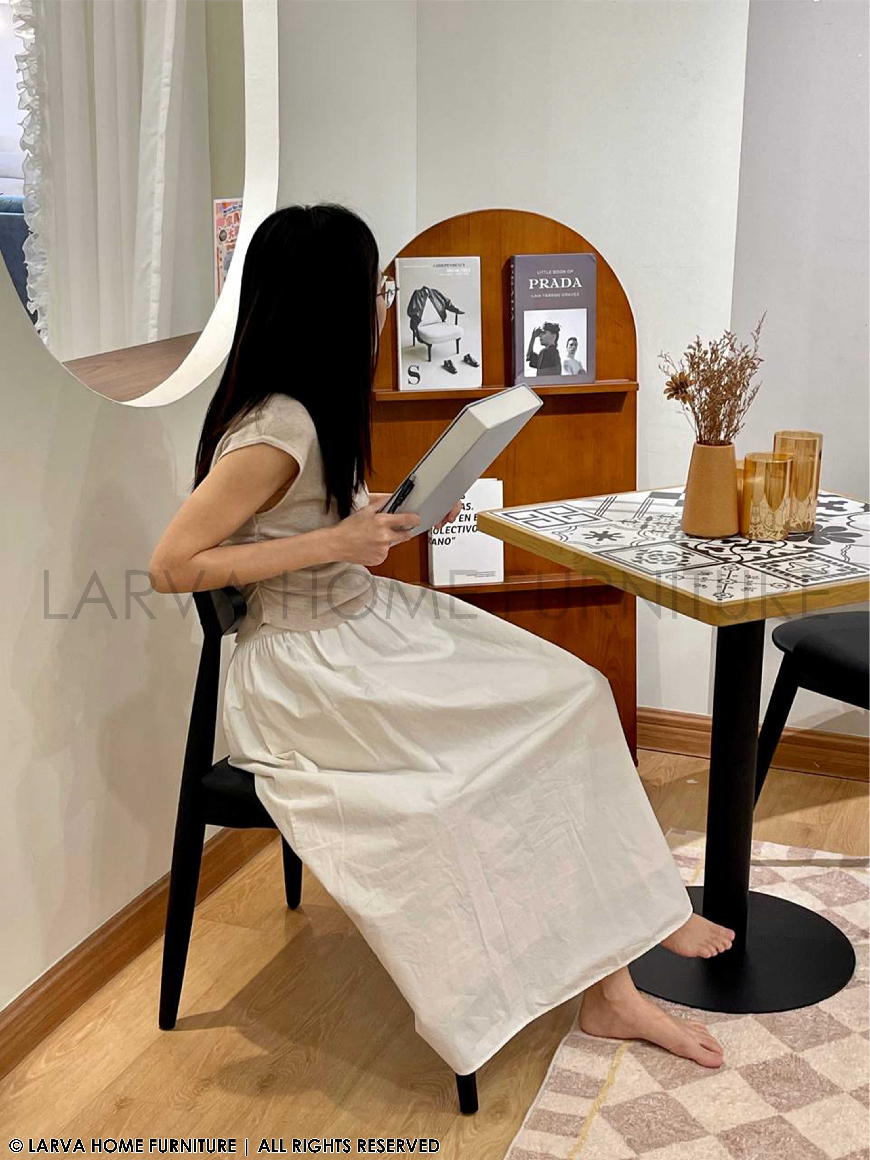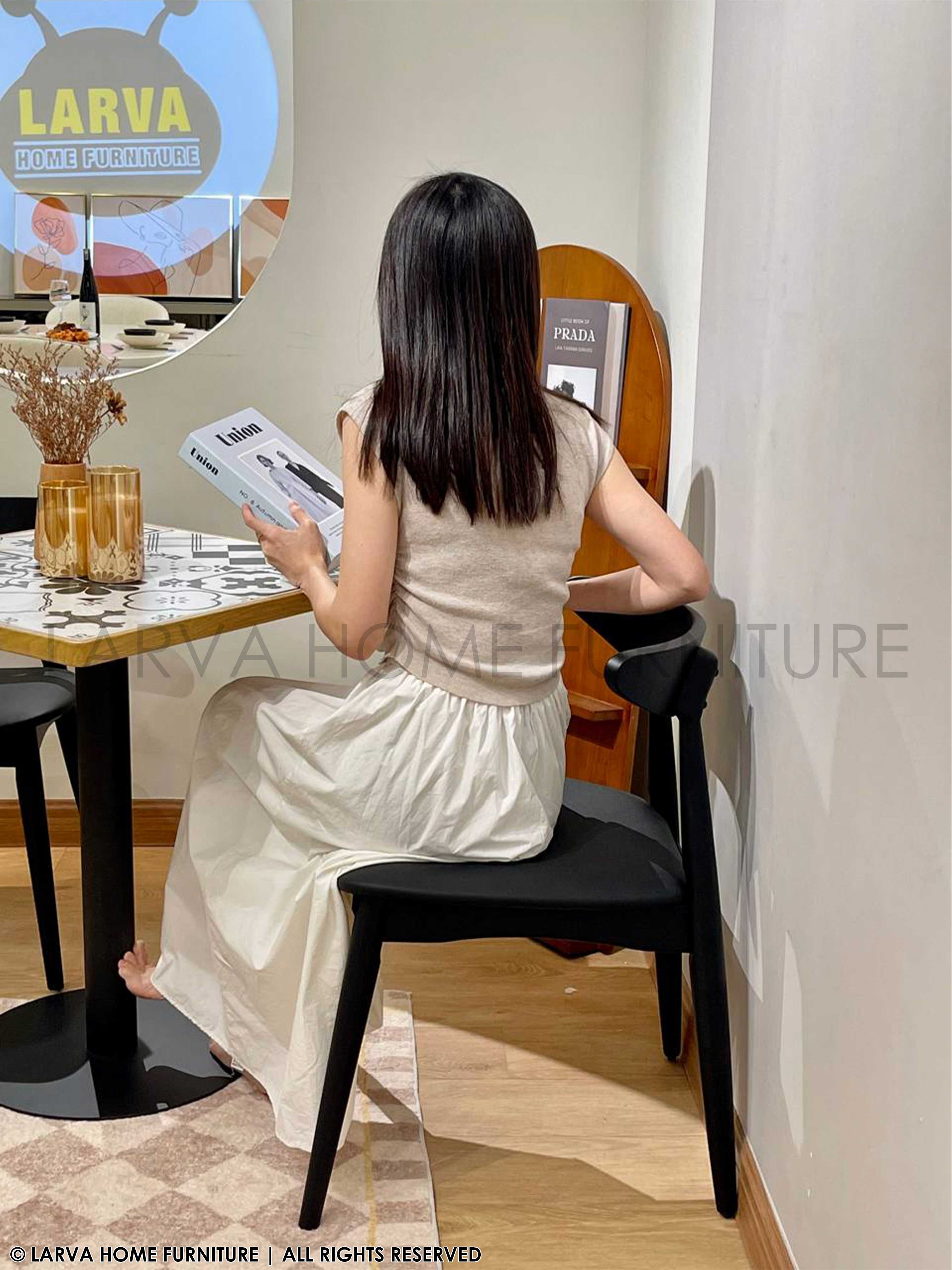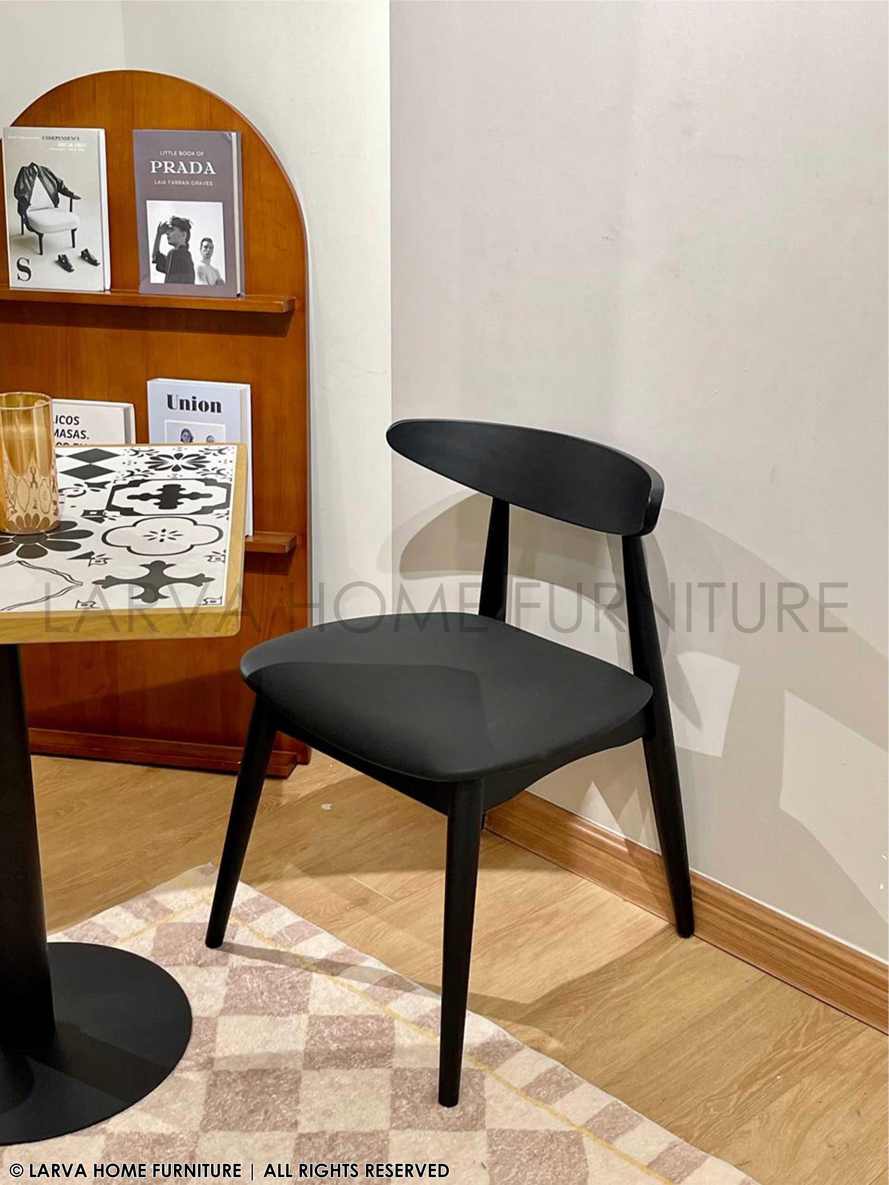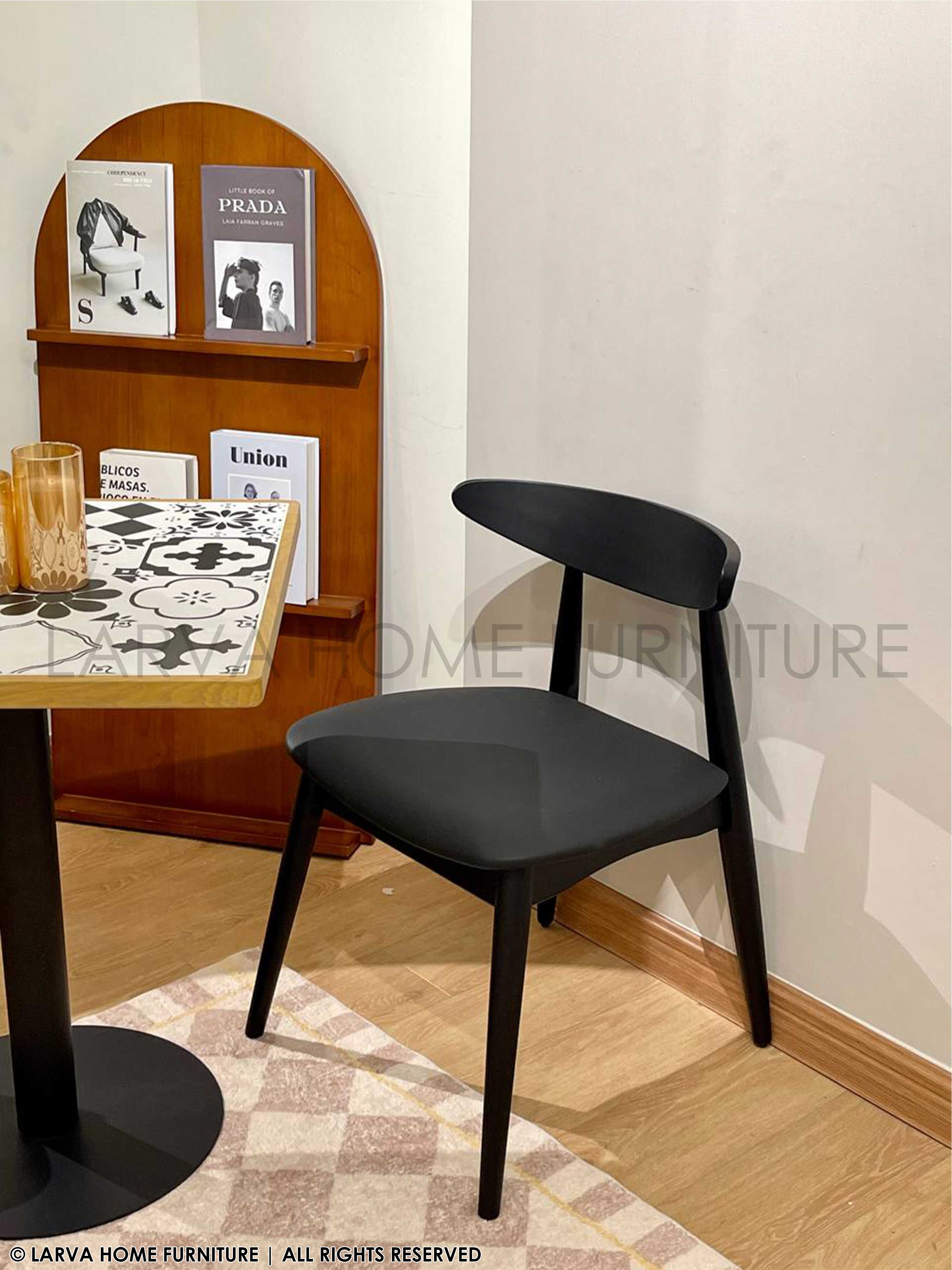 Make a bold statement with this sleek black Phil Designer Chair. The sculpted backrest and angled legs reflect modern craftsmanship at its finest. Built with comfort and aesthetics in mind, it fits seamlessly in any contemporary space. A must-have accent piece that combines artful design with everyday usability.
