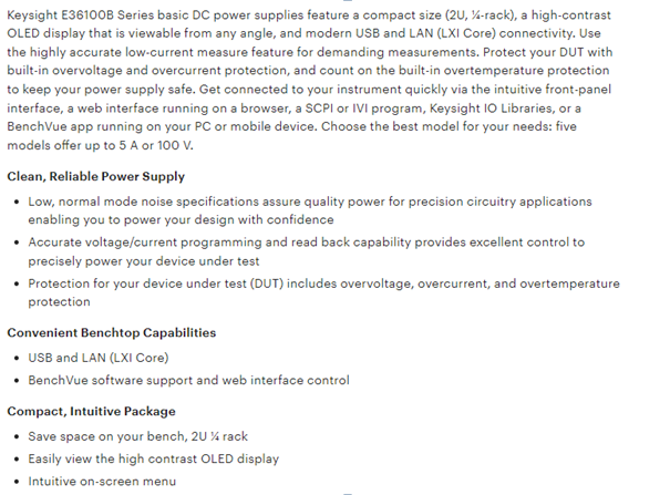 Keysight E36106B DC power supply, single-output, 100 V, 0.4 A, 40 W