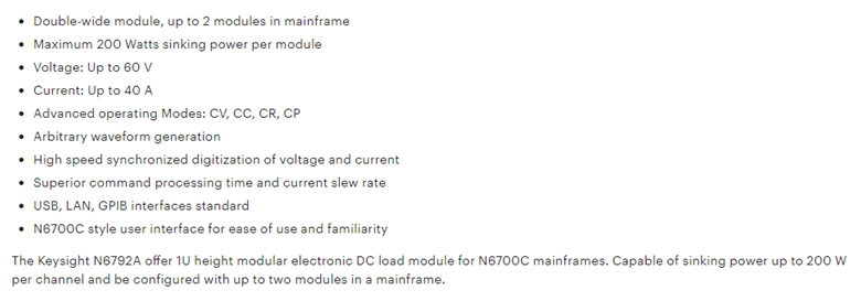 Keysight N6792A DC electronic load module, 1U height, 60 V, 40 A, 200W