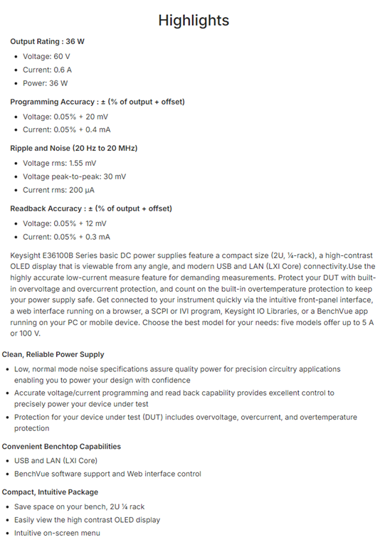 KEYSIGHT E36105B DC Power Supply, 60V, 0.6A, 36W