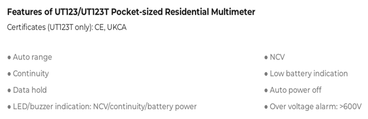 UNI-T UT123/UT123T Pocket-sized Residential Multimeter