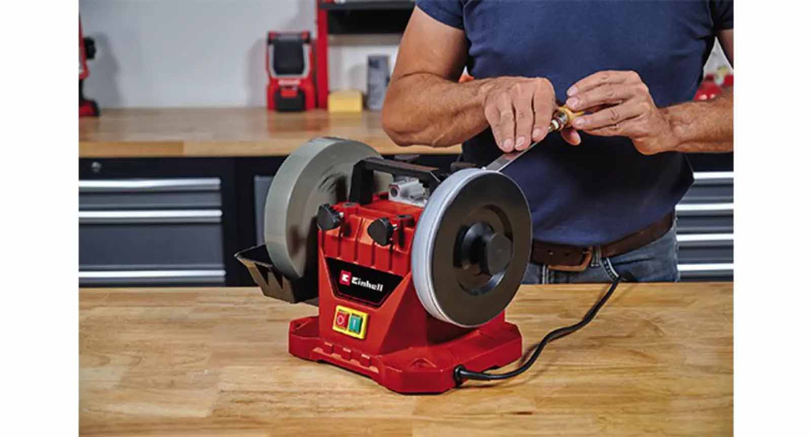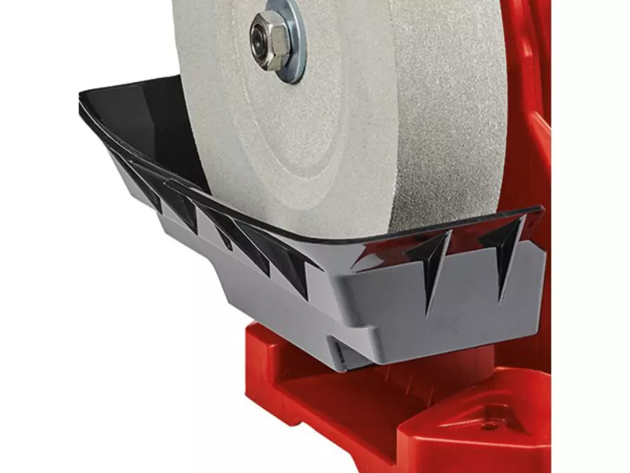 The Einhell wet sander TC-WG 200 is ideal for sharpening your tool without damaging the workpiece to be machined. During sanding, water is slowly supplied to the cutting edge, preventing frictional heat and annealing of the disc. The universal device provides flexibility for sanding a wide variety of tools, while the corrosion-free water tank cools the workpiece. The angle gauge for adjusting the sanding angle is included in delivery. The sanding wheel can be prepared with the grindstone. Four rubber feet damp vibrations and ensure firm and secure standing. Delivery includes a slow-running, fine-grained wet sanding wheel and a leather sanding wheel for removing burrs.