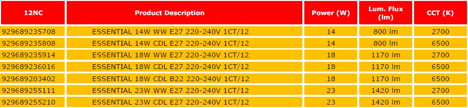 • The Essential range is widely used to replace incandescent light bulb at all kinds of general lighting applications.