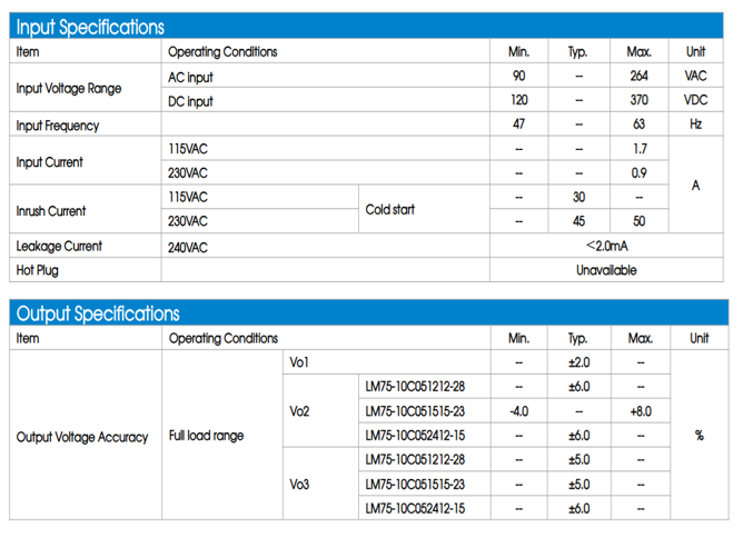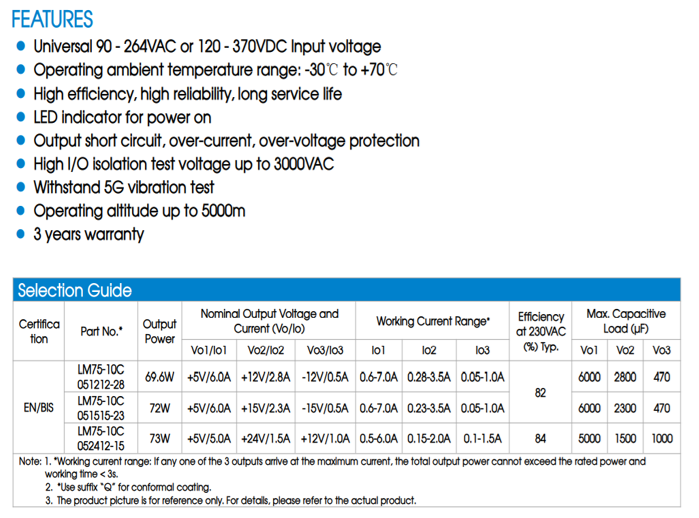 MORNSUN LM75-10C051212-28 SERIES AC/DC 75W ENCLOSED SWITCHING POWER SUPPLY