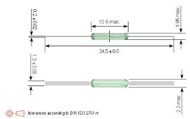 KSK-1A35 Series Reed Switch has a glass length of 10.5mm and diameter of 2.1mm. Rated power 20 W, Switching voltage 200 VDC, Switching current 1 Amp DC. UL approval, flat leads.