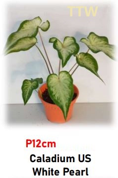 Elevate your garden with the breathtaking beauty of Caladium 'US White Pearl'! This exceptional variety boasts large, heart-shaped leaves in a radiant, glistening white, elegantly outlined with a thin green margin. Unlike many white caladiums, 'US White Pearl' is known for its strong sun tolerance, holding its brilliant color even in brighter conditions while still thriving in shade.
