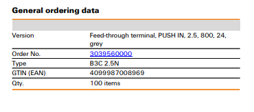 WEIDMUELLER 3039560000 B3C 2.5N B-Series Push In Terminal Block