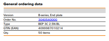 WEIDMUELLER 3040540000 BEP 3C 2.5N BL B-Series Push In Terminal Block