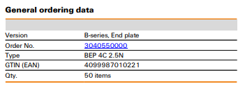 WEIDMUELLER 3040550000 BEP 4C 2.5N B-Series Push In Terminal Block