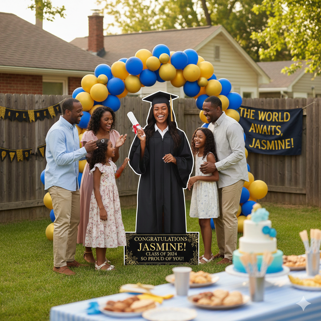A customized graduation standee featuring the graduate’s photo, name, and congratulatory message makes a perfect graduation idea for photo sessions and family celebrations.