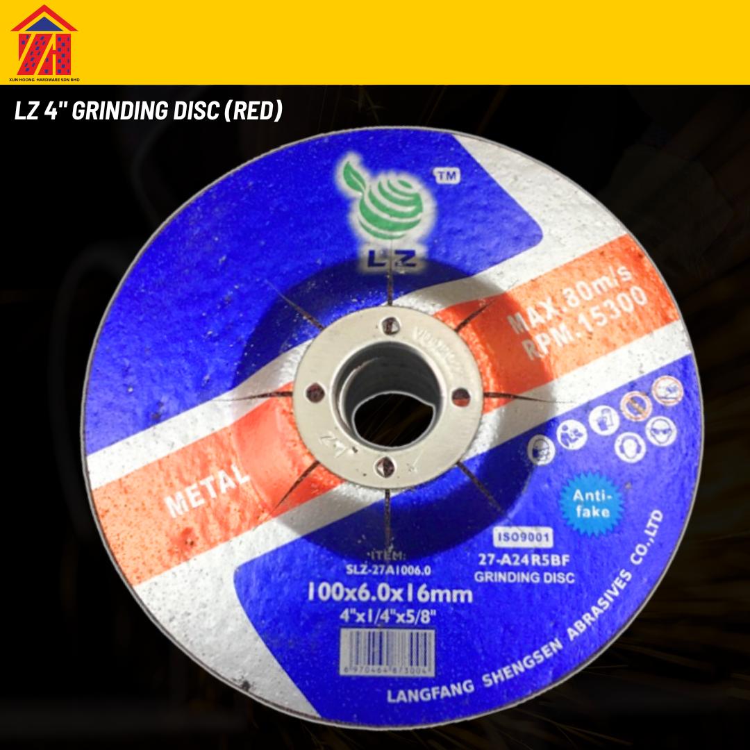 - LZ Cakera Grinder Logam 4” (Merah) bersaiz 100x6.0x16mm direka khusus untuk kegunaan angle grinder bagi kerja pengisaran logam yang lasak dan berterusan. Ideal untuk besi, keluli dan logam berat lain. Dibuat dengan bahan tahan haba dan reka bentuk berkualiti tinggi untuk prestasi konsisten dan selamat digunakan.