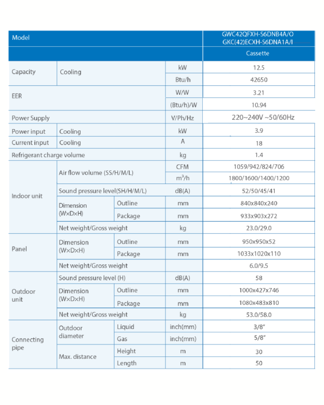 GREE CEILING CASSETTE GWC42QFXH-S6DNB4A/O GKC(42)ECXH-S6DNA1A/I 42600BTU