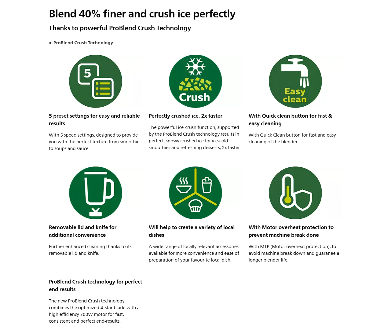 Enjoy the finest smoothies with ProBlend Crush technology. Our unique 4-star blade and energy efficient 700W motor make perfect smoothies every time. Its powerful ice-crush button transforms hard ice into smooth blends, twice as fast.