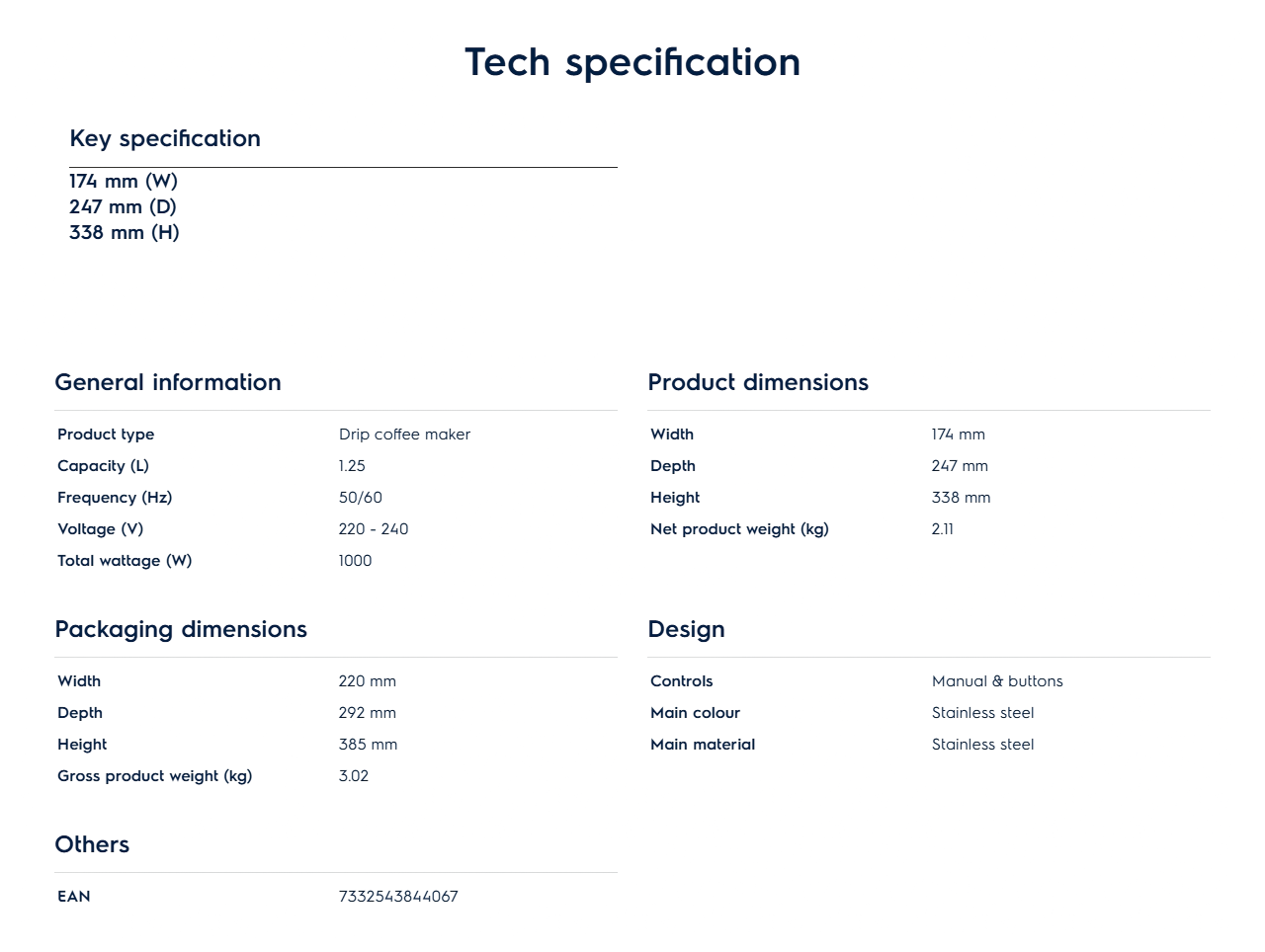 Programme machine up to 24 hours in advance. Aroma selector adds richness to your coffee. Anti-drip system prevents coffee stains.