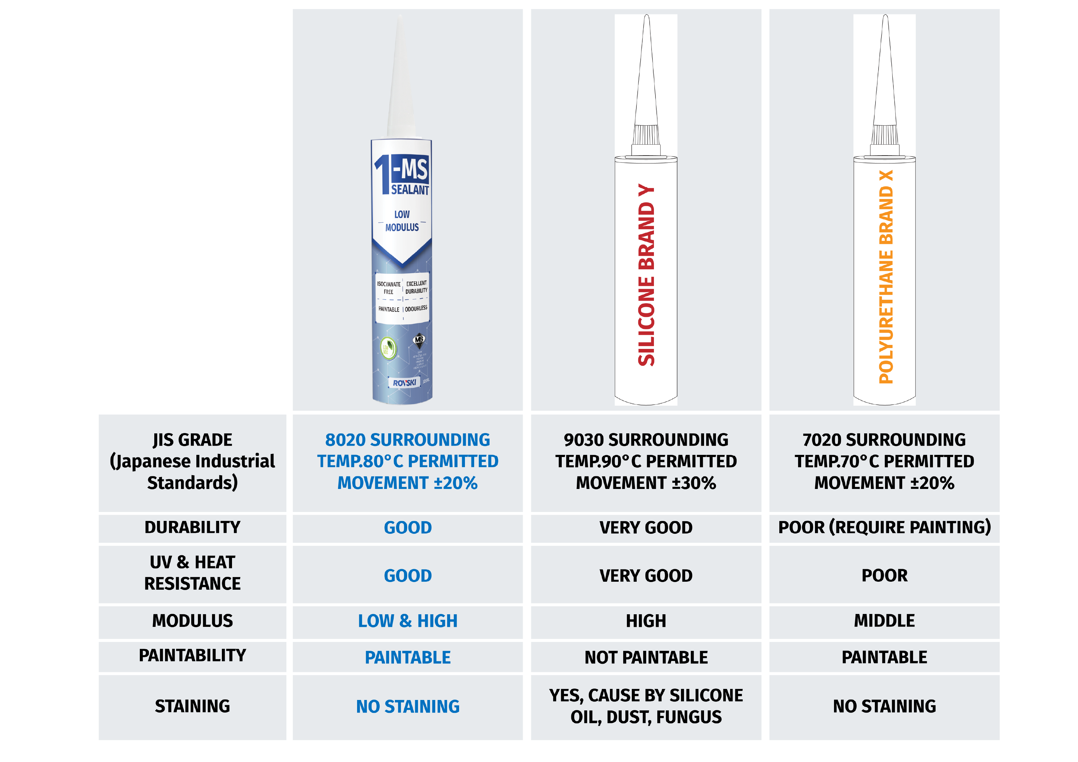 The comparison table above highlights the key differences between 1-MS (modified silicone), silicone sealants, and polyurethane (PU) sealants in terms of durability, UV resistance, paintability, and staining.