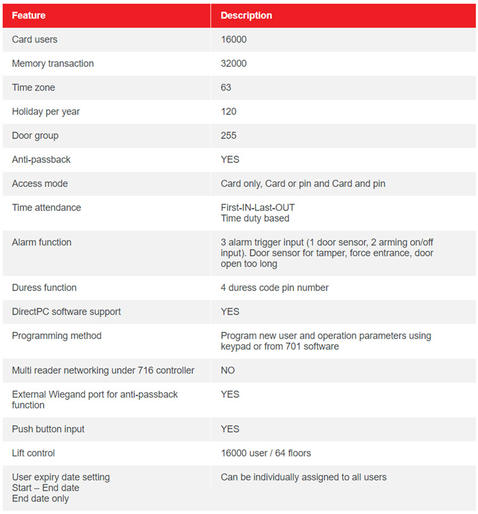 AR725E is a card access reader typically installed at door, pedestrian gate and barrier gate to restrict unauthorized access. It reads EM or Mifare proximity card. It supports RS485 and TCPIP connection, 16,000 users and 32000 event memory. It has a built-in touch panel keypad.