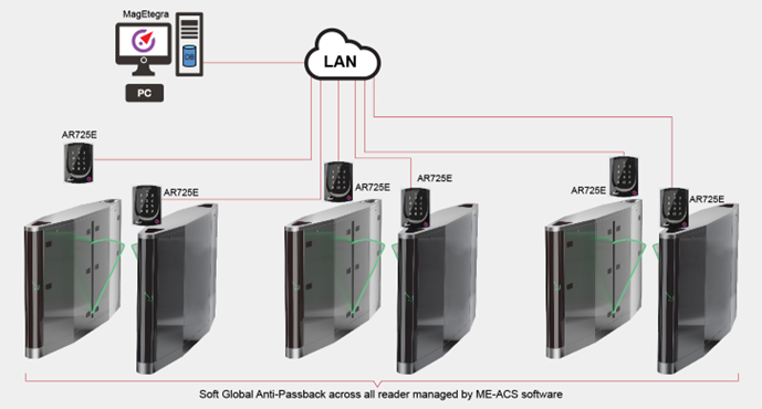 Soft global anti-pass back This is especially useful when you have multiple lanes of the pedestrian gate where you wanted to ensure every user cannot cheat the entrance bypassing their cards to their friends to enter multiple times with the same cards. A global anti-passback across all readers in every lane will prevent this. You can group each AR725E as an “Entry” or “Exit” reader and allow MagEtegra ME-ACS software to automatically manage the global anti-pass back.