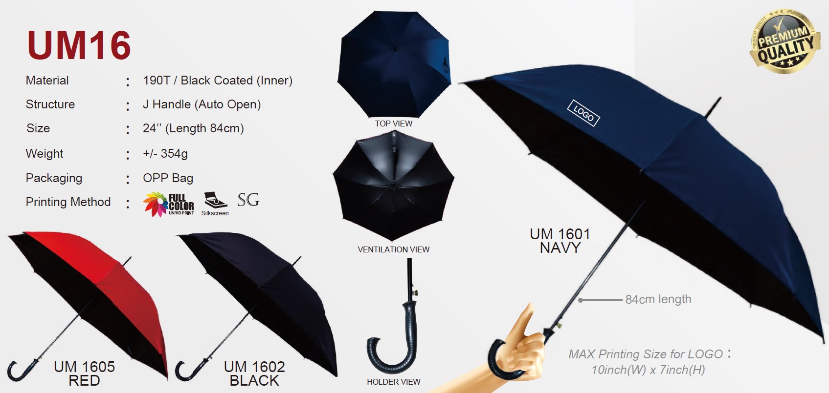 Structure: Full Fibre Shaft & Ribs / J Handle (Auto Open) — A curved J-shaped, sturdy, and lightweight handle designed for enhanced durability, wind resistance, reliable weather protection, and a comfortable grip with a smooth automatic open function for quick and effortless deployment