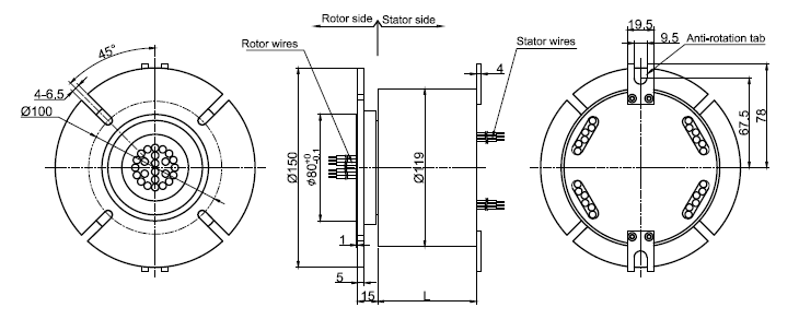 MW3119 series is large current slip ring with OD (outer diameter) 119mm and rotor flange installation,