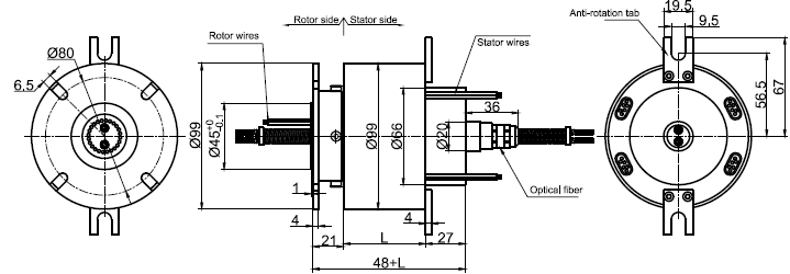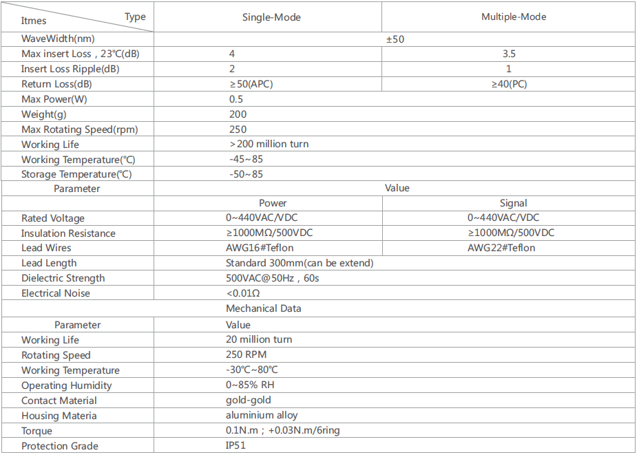 It can perfectly transmit data on 360° rotating. It is also especially suitable for occasion where it needs to transmit large volume data/signal from permanent position to rotation position on unlimited, continuous or discontinuous rotating, which can improve mechanical property, simplify system operation and avoid the rotating of turning joints destroy fiber optics.